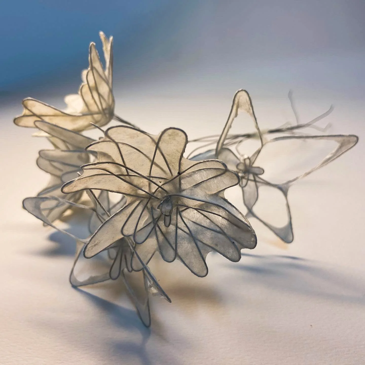 Flowers created by dipping formed wire into high-shrinkage abaca paper fiber.