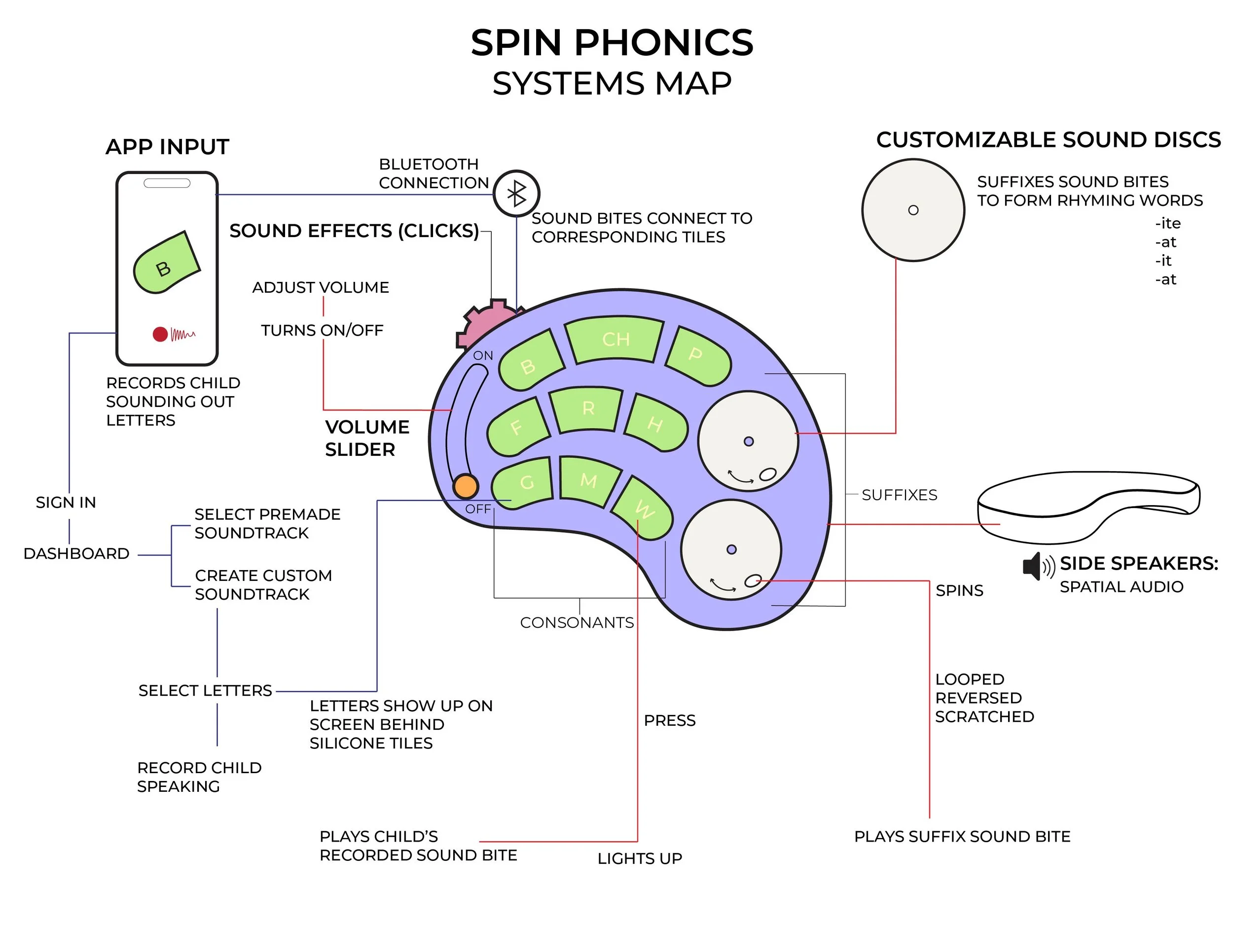 Spin Phonics is a soundboard device for 3-5 year olds to explore letter sounds through open play and lay the foundation for future reading. Created in collaboration with Anna Yu, Jessie Duit, and Nozima Nurullaeva under mentorship of Debera Johnson.