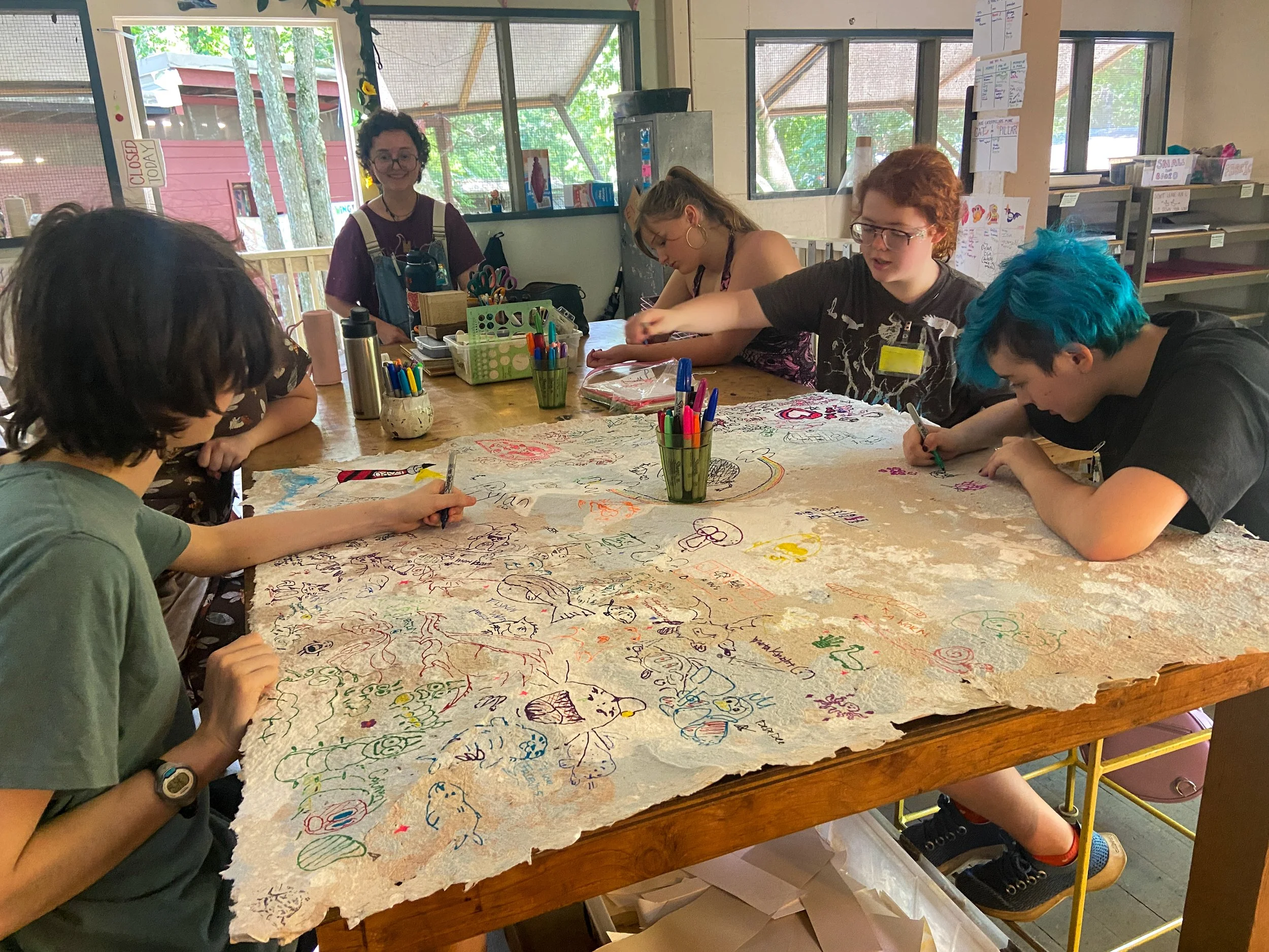 During this workshop, a group of learners collaborated on forming a giant sheet of paper, drawing on it, and folding it into origami.
